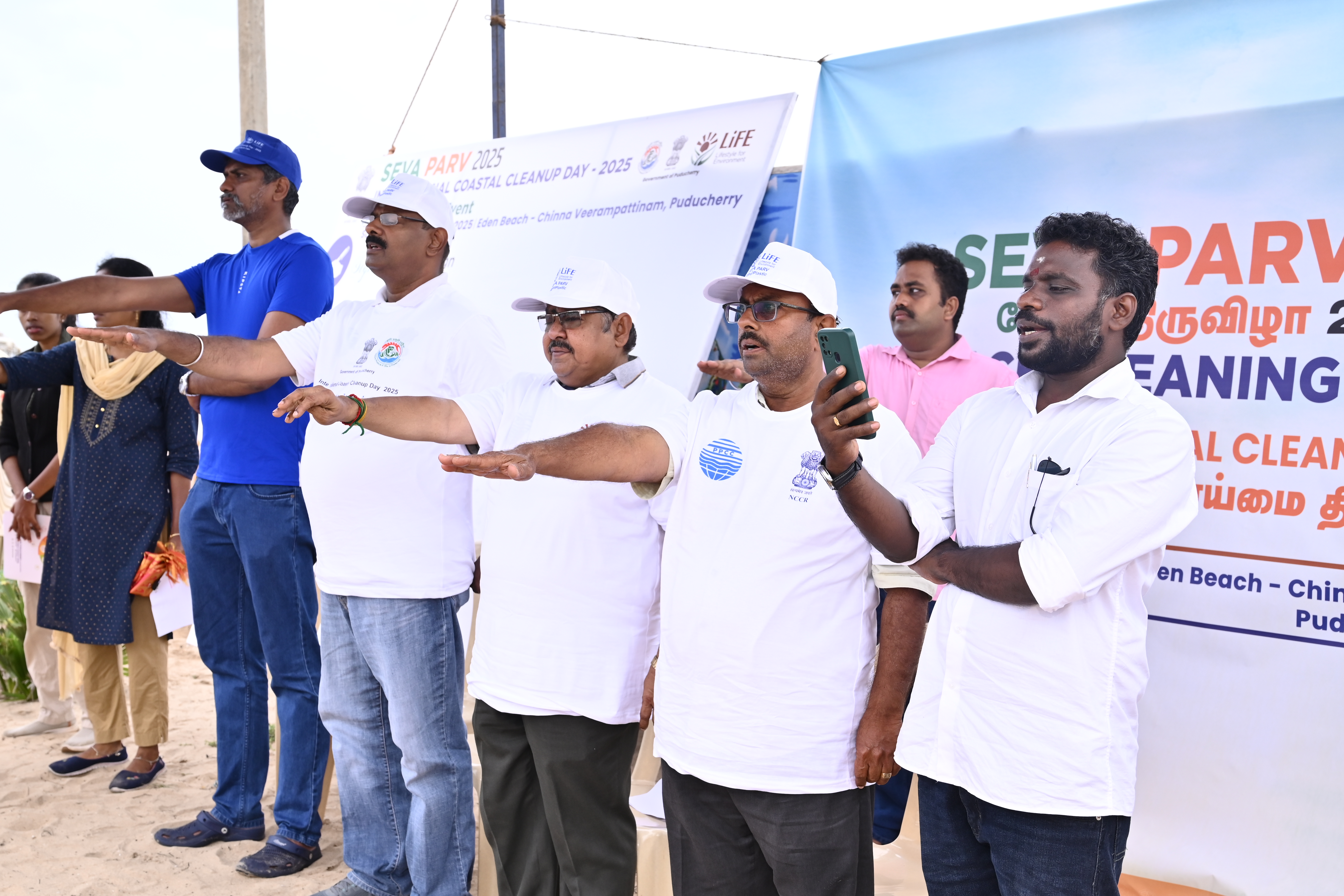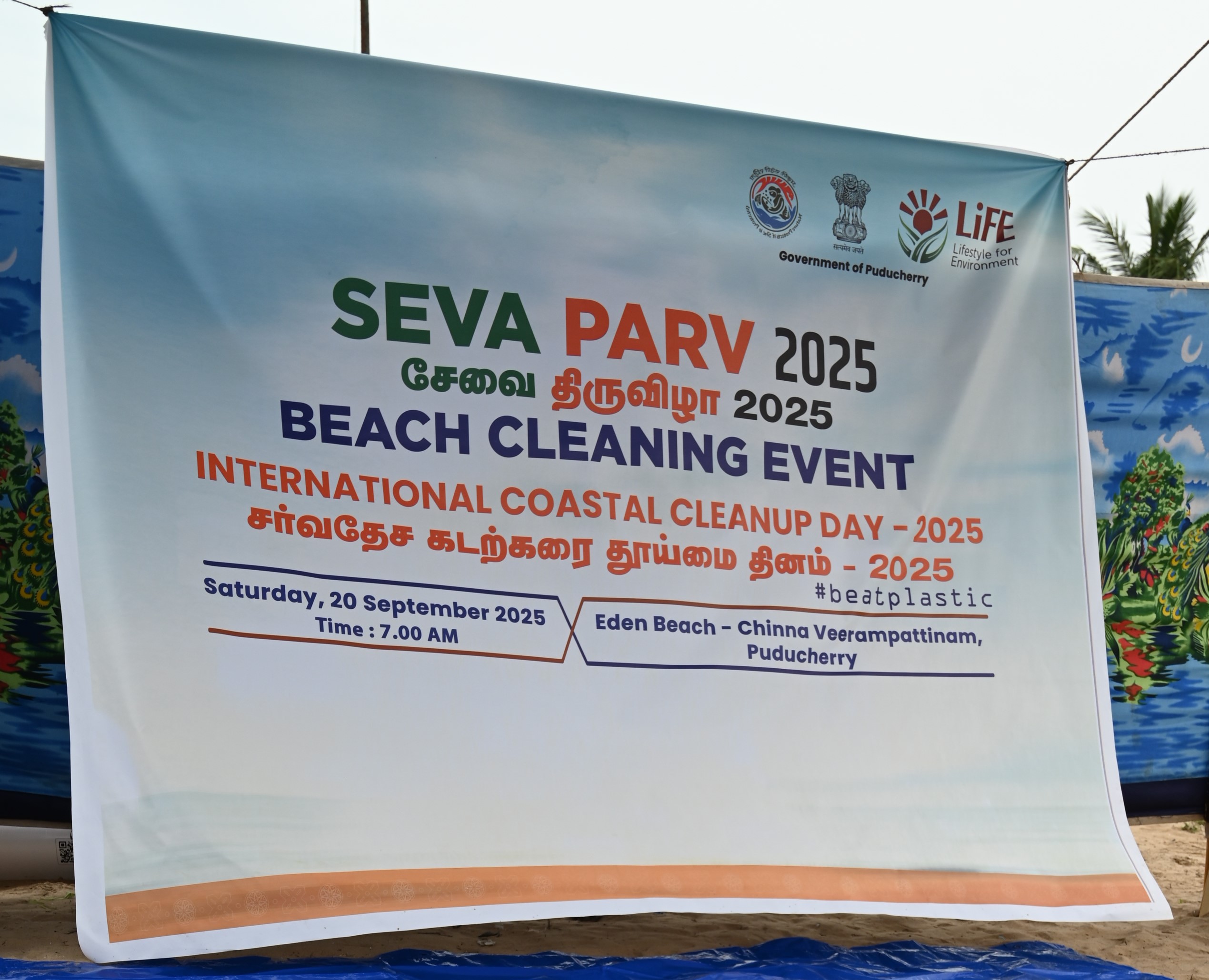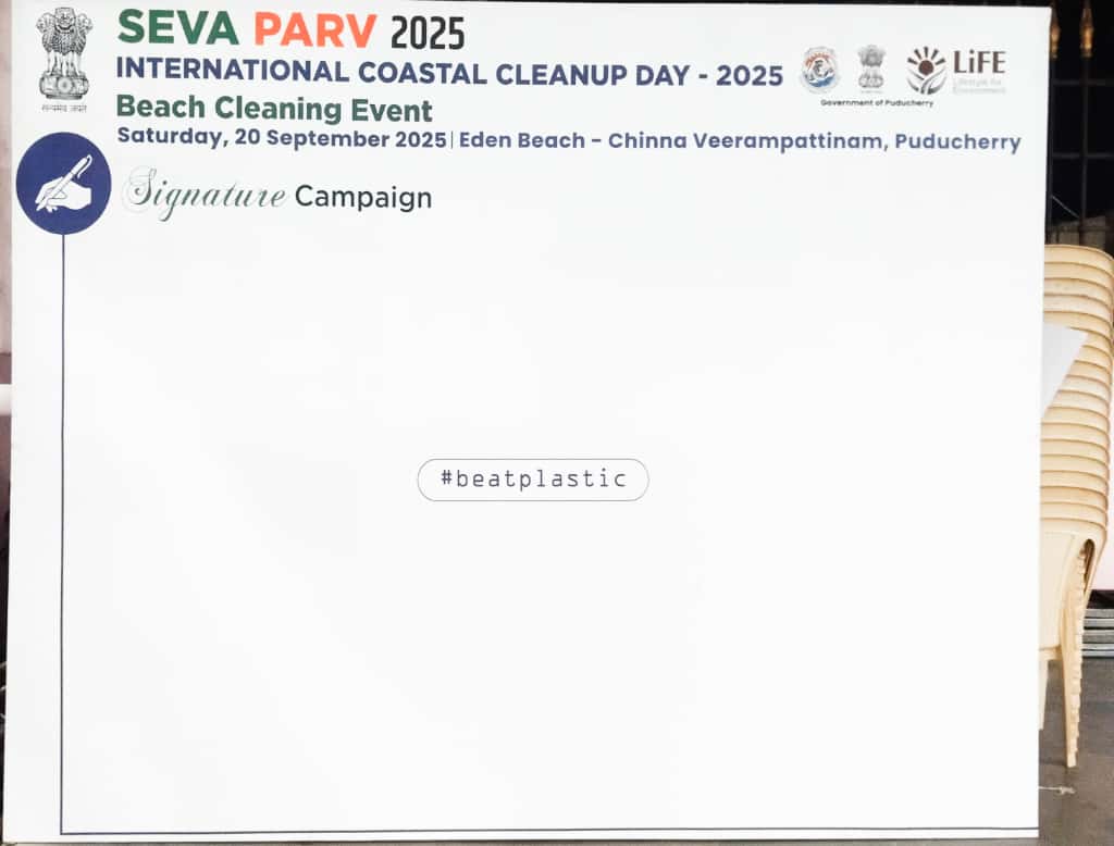 The Union Ministry of Environment, Forest and Climate Change (MoEFCC), in collaboration with the Government of Puducherry, organized a large-scale Beach Cleaning Drive at Eden Beach, to Chinna veerampatinam Beach on 20th September 2025. The initiative was part of the “Seva Parv” campaign, commemorating International Coastal Clean-up Day (ICCD) 2025.