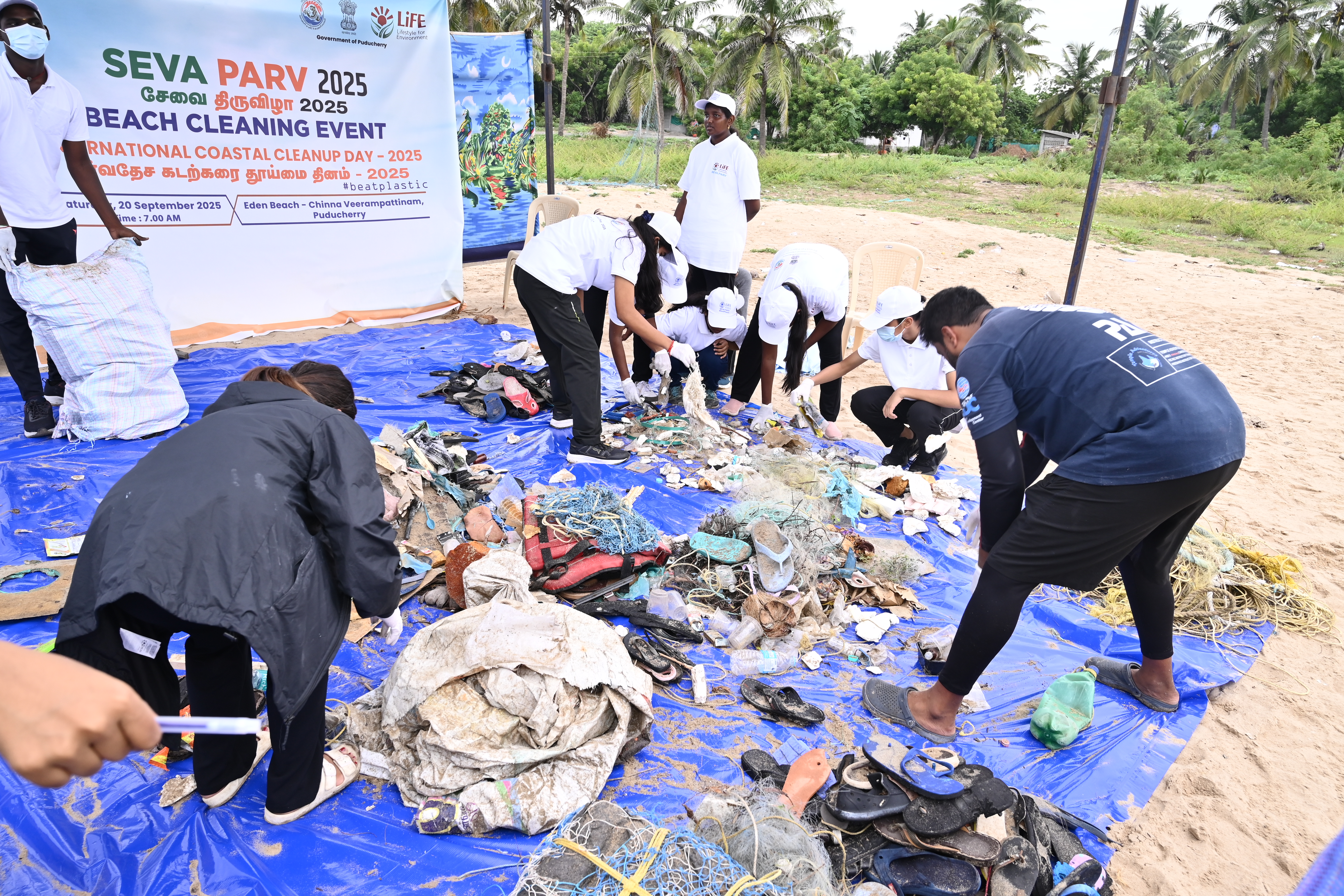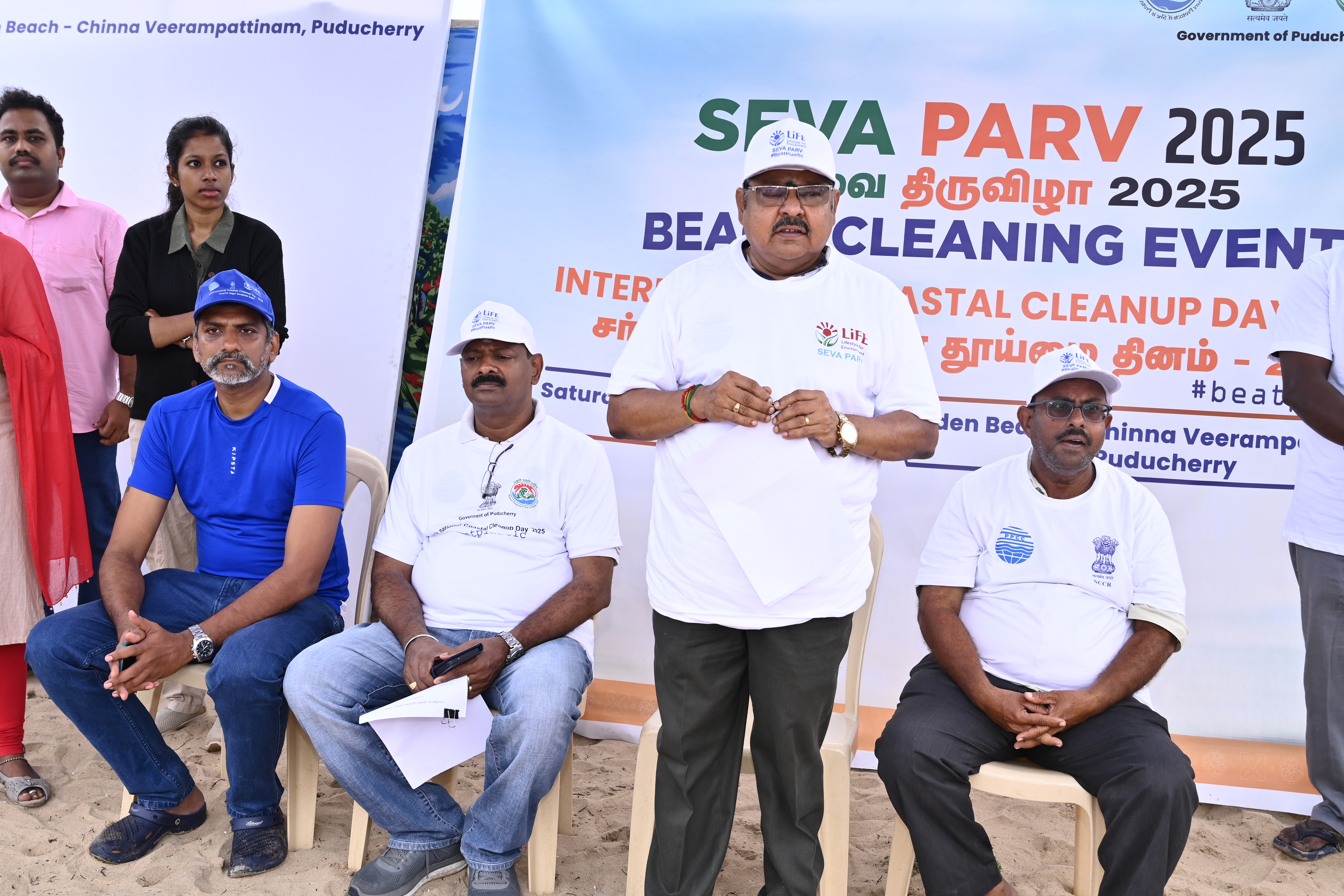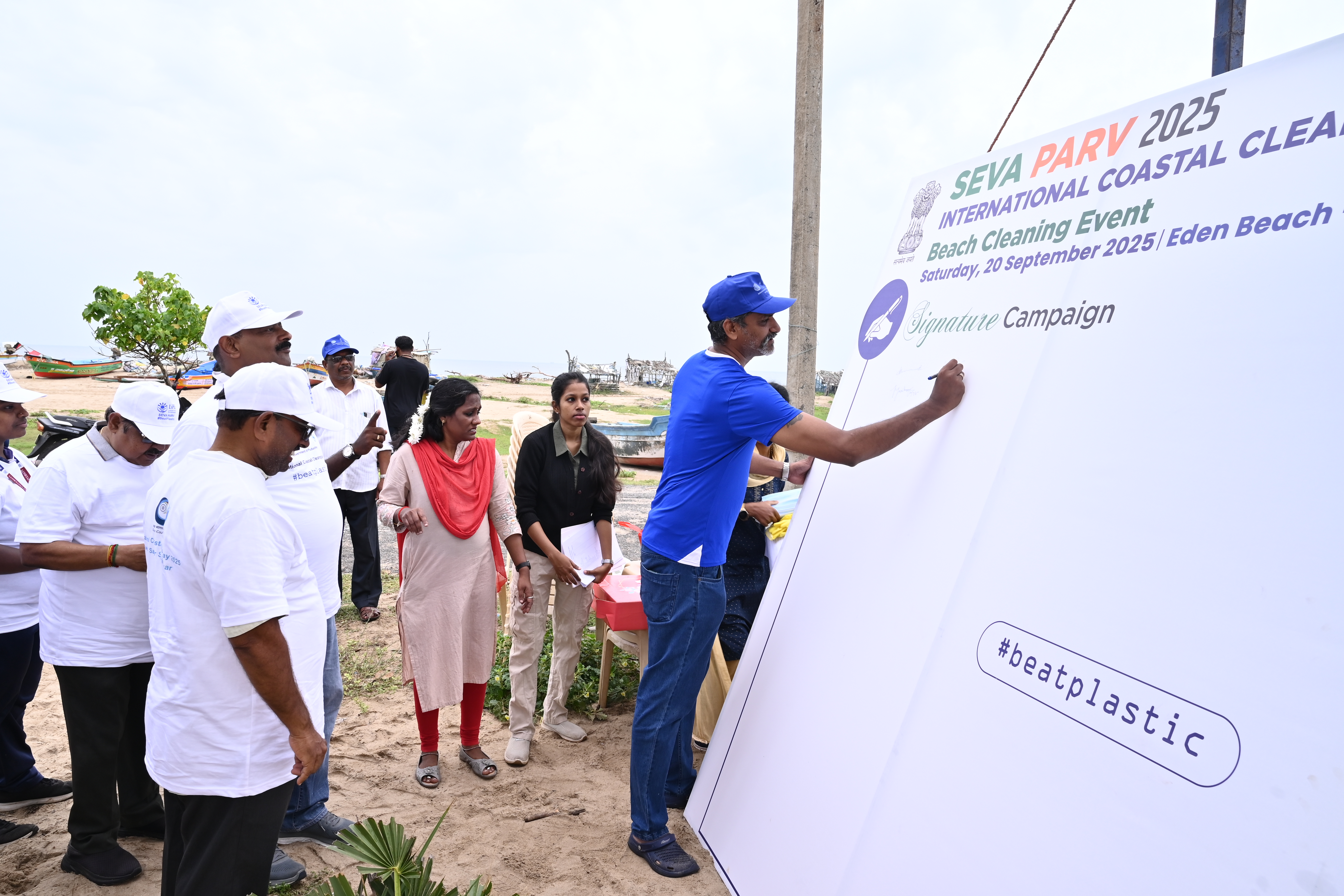 The Union Ministry of Environment, Forest and Climate Change (MoEFCC), in collaboration with the Government of Puducherry, organized a large-scale Beach Cleaning Drive at Eden Beach, to Chinna veerampatinam Beach on 20th September 2025. The initiative was part of the “Seva Parv” campaign, commemorating International Coastal Clean-up Day (ICCD) 2025.